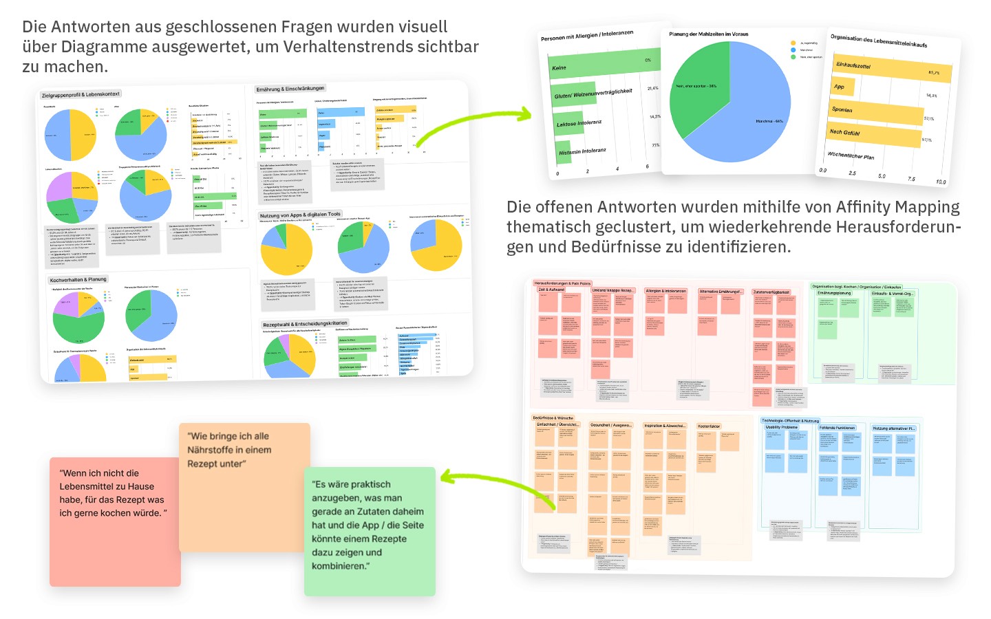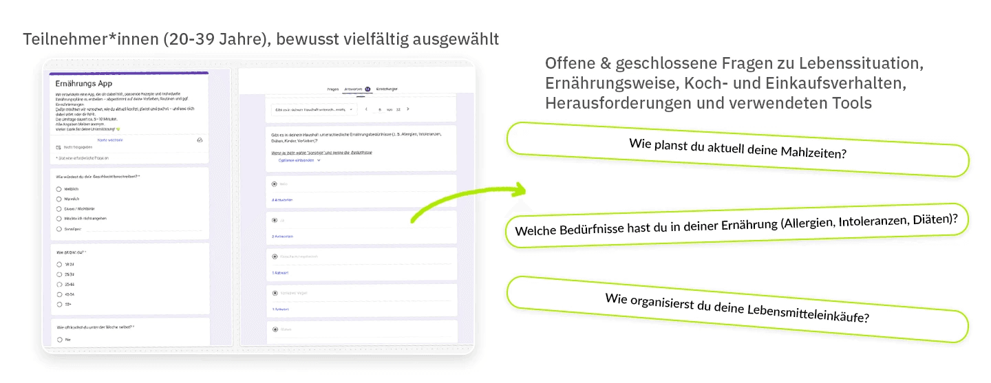 Ein Online-Fragebogen kombinierte quantitative Fragen zum Koch- und Planungsverhalten mit offenen Antworten zu Frustrationen, Gewohnheiten und der Wahrnehmung von KI-Tools. Zusätzlich testeten eine Auswahl der Teilnehmenden den bestehenden MVP.